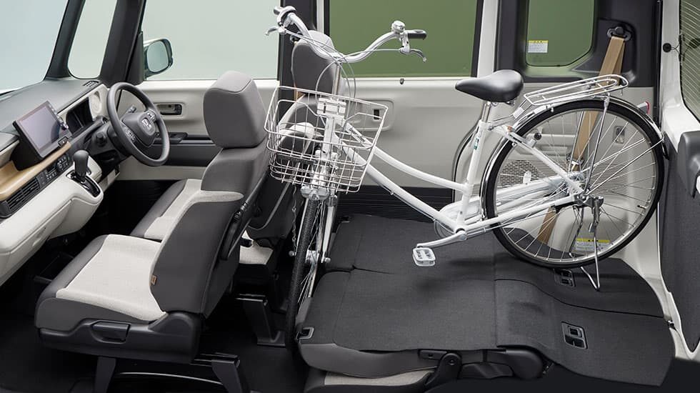 後席の背もたれを倒すと、シート全体が足元に深く沈み込んで、フラットで低い床が出現する機構のことです。27インチもの自転車が軽自動車で積込み出来るので、軽自動車の枠を超えていますね。