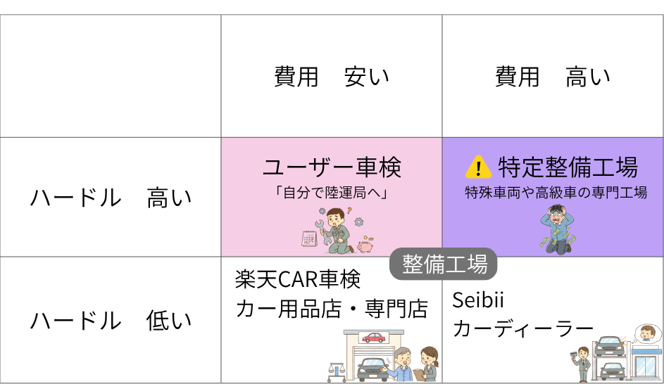 | ①ユーザー車検 | ②楽天Car車検 | ③認証・指定工場での車検(町工場) | ④ディーラー車検 | |