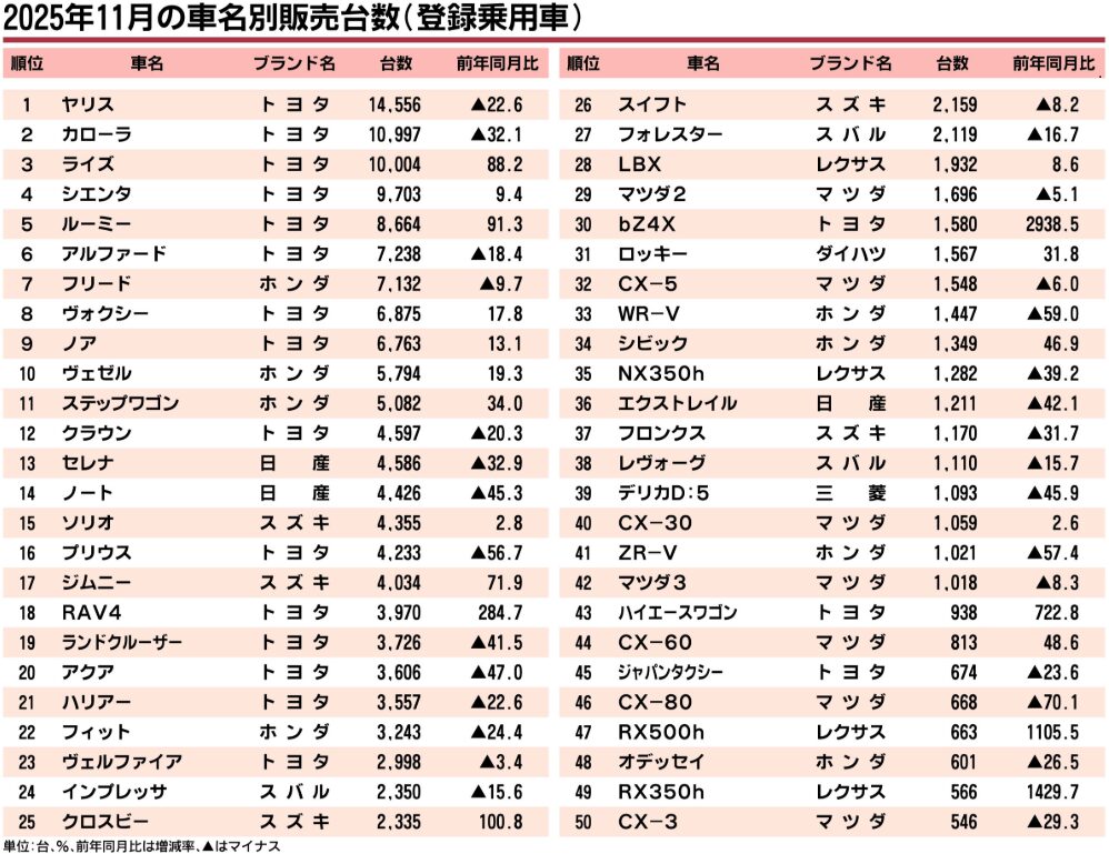 合計27車種(RXは1車種に集約)が2025年11月度の国内登録乗用車上位50選にランクインしています。