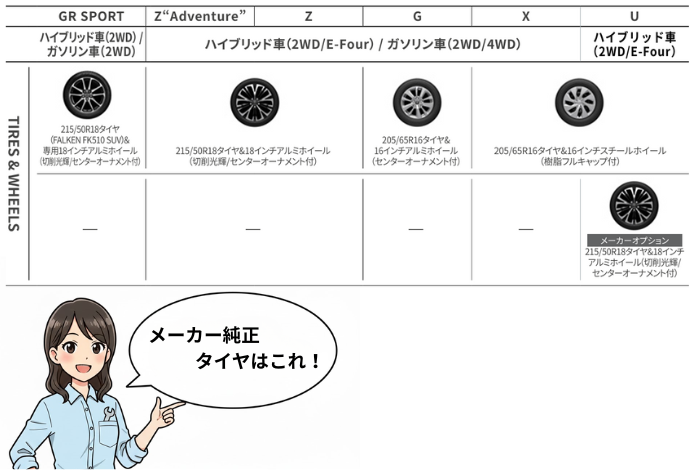 ※カローラクロスは16インチまでのインチダウン、19インチまでのインチアップが可能とされていますが、純正サイズ以外の装着には注意が必要です。